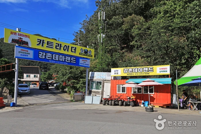강촌 테마랜드는 춘천 강촌역 인근 북한강변에 위치한 레포츠 전문 시설이다. 최신 장비와 자연형 교장을 갖춘 곳으로, 서바이벌 게임장과 사륜바이크, 카트 라이더 같은 육상 레포츠가 있고, 래프팅과 수상스키, 플라이피시, 바나나보트, 웨이크보드 등 수상 레포츠도 이용 가능하다. 각 프로그램은 개별 이용만이 아니라 패키지로 할인된 가격으로 이용 가능하며, 숙박과 연계 이용도 가능하다. 펜션과 글램핑장을 함께 운영하며, 인근 펜션과 연계 이용할 수 있다. (자료출처 : 대한민국 구석구석 - korean.visitkorea.or.kr) 위치 : 펜션에서 차량으로 약 21분, 17.3km